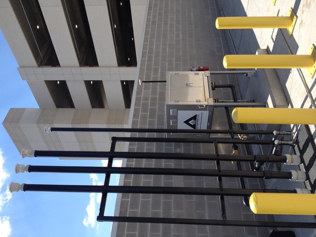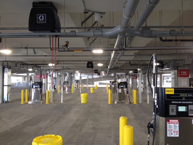 Austin Bergstrom International Consolidated rental car facility; 3rd floor showing dispensers and vacuum systems.
