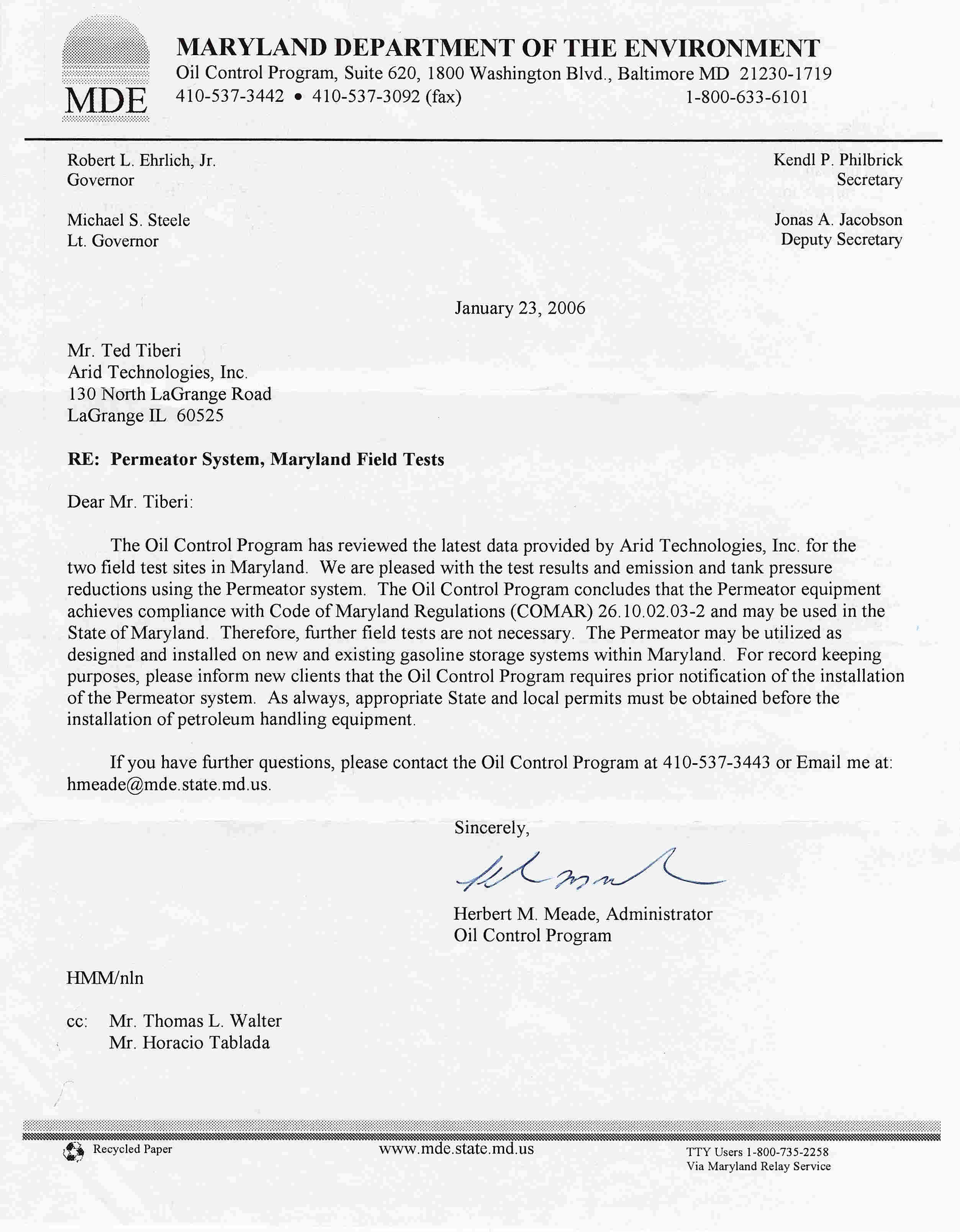 Wheaton, Illinois - ARID Technologies, Inc. announced that the Maryland Department of the Environment (MDE) certified on January 23, 2006 that ARID Technologies' PERMEATOR gasoline vapor containment system achieves compliance with the Code of Maryland Regulations (COMAR 26.10.02.03-2), and it can be utilized on both new and existing gasoline storage systems within Maryland. The state was "pleased with the test results and emission and tank pressure reductions using the PERMEATOR system."